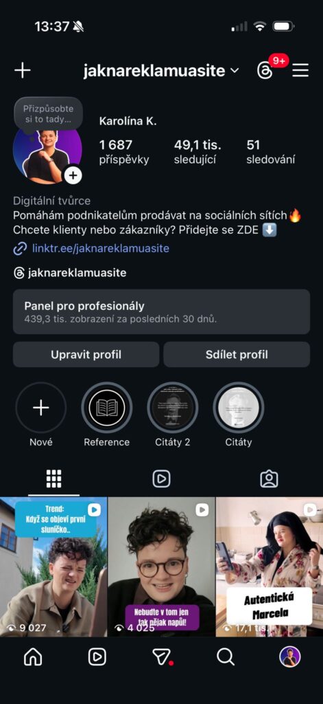 Provedu vás (společně s dalšími experty z mého týmu) vším od copywritingu, přes produkci (svícení, ostření, nastavení mobilu/foťáku), střih videí přímo na Instagramu nebo v aplikaci CapCut, hledání virálních trendů až po tvorbu grafických příspěvků v aplikaci Canva.